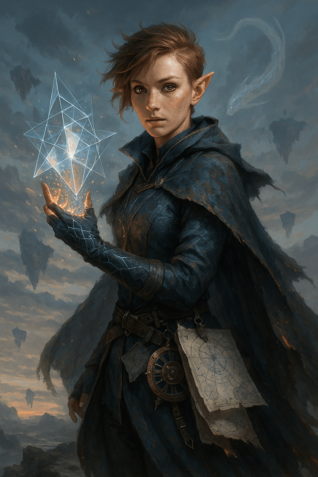 In the high glow of Skyreach’s rise, when crystal isles first learned to hold themselves against the wind, Irielle attached herself to the laboratories that studied failure. Velian Thalos—then still more comet than caution—opened a door for her and said, “Show me a proof that breathes.” She did. Her early papers were annotated with scorch marks and elegant math, demonstrations that Aether could be coaxed into temporary forms—ladders of light, self-correcting bridges, even a ‘listening prism’ that turned Star-Serpent whispers into diagrams across a sheet of beating air. She tested her hypotheses outside, where the sky could disagree safely, and returned with hair full of sparks and numbers the elders had not considered. When someone asked why she refused to specialize, she replied, “Because the cosmos doesn’t. It sings harmony.”