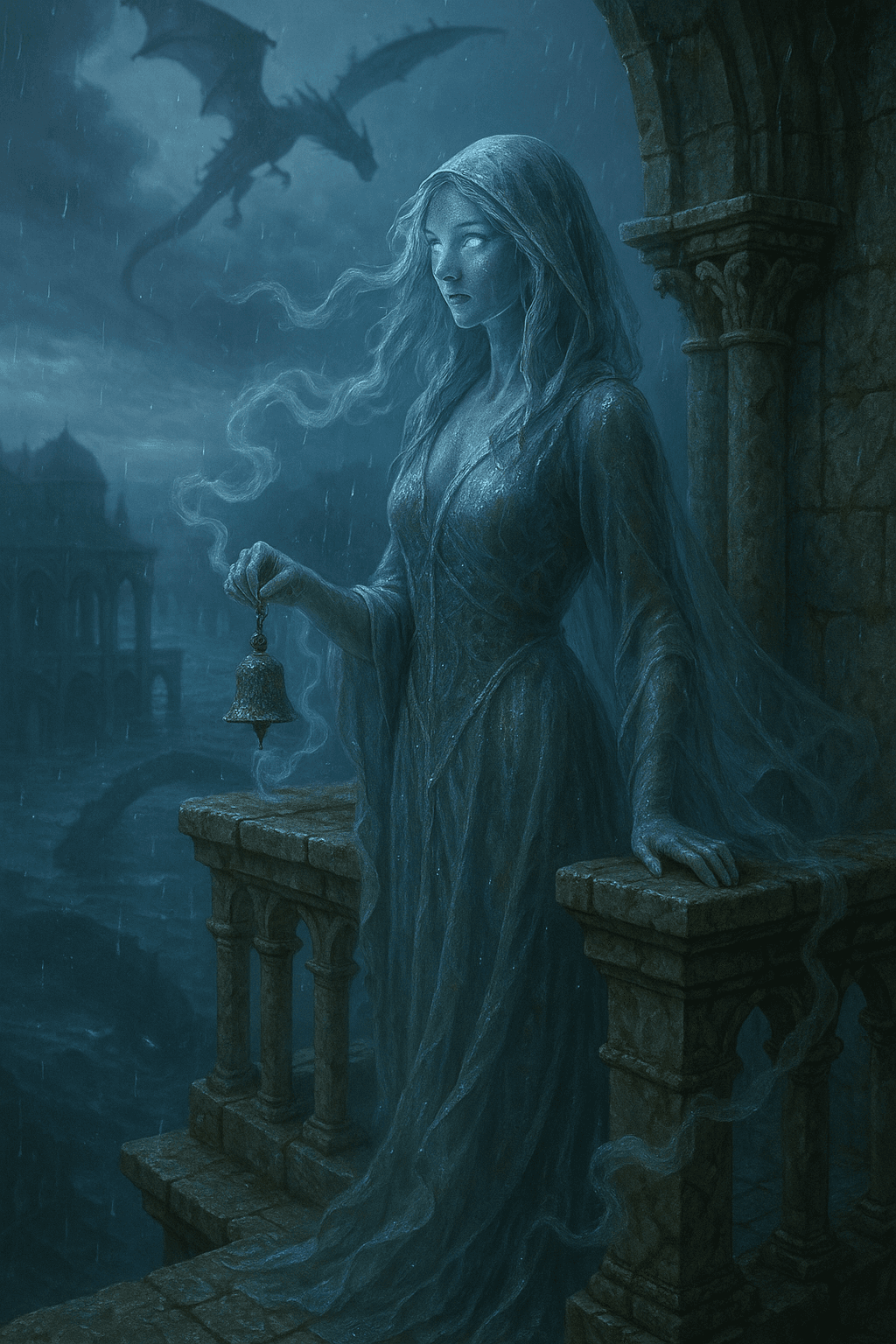 Their counterpart is Nymrielle, another spirit bound to counsel and omen. Together they tend the ledger of echoes—an archive of songs, scents, and names that survive in the coral libraries beneath the streets. When the Deep Chime trembles through the archipelago, the two spirits stand on opposite ends of a drowned avenue and hum a low harmonizing tone. Echo Serpents rise like silver script from the water, braid between them, and then dive, carrying the pair’s questions into the slow mathematics of the sea. Answers return as patterns in rain, as a gull’s turning, as a child’s dream of dry shoes found where none should be. Mistwalker writes those answers in salt-resistant ink along the inner rails of the Tidecaller’s balcony so the wind must read them before it moves on.