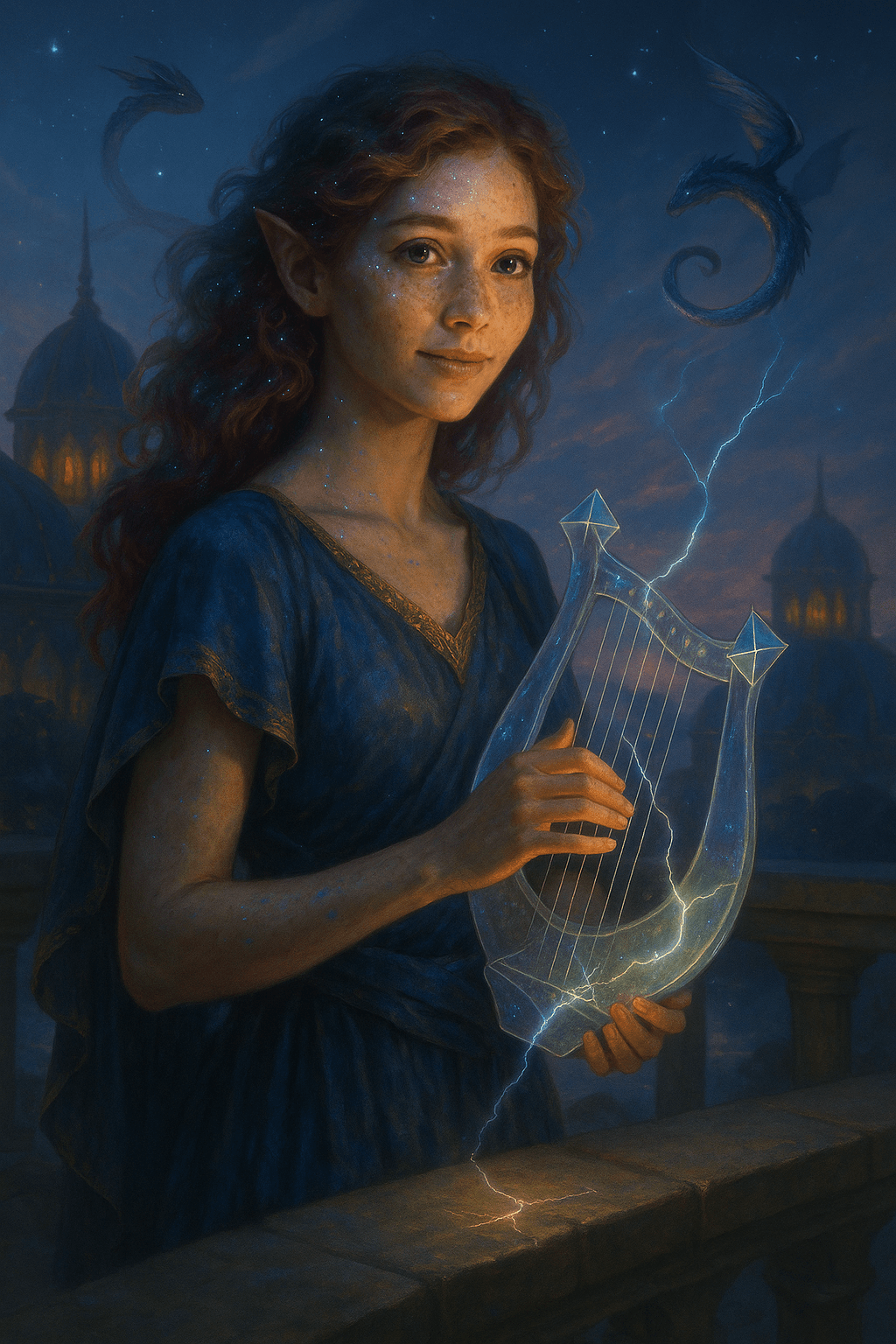 Her tools were simple: a palm harp of Aether-glass, a chain of tuning prisms, chalk for marking resonances on stone, and a diary crammed with tiny notations—arcs of pitch, sketches of broken sigils, and small drawings of the Glimmerdrakes that gathered whenever she practiced. She discovered that those playful drakes matched her tones instinctively; with them swirling like living metronomes, she led nightlong vigils that kept the lifts purring and the observatories steady.