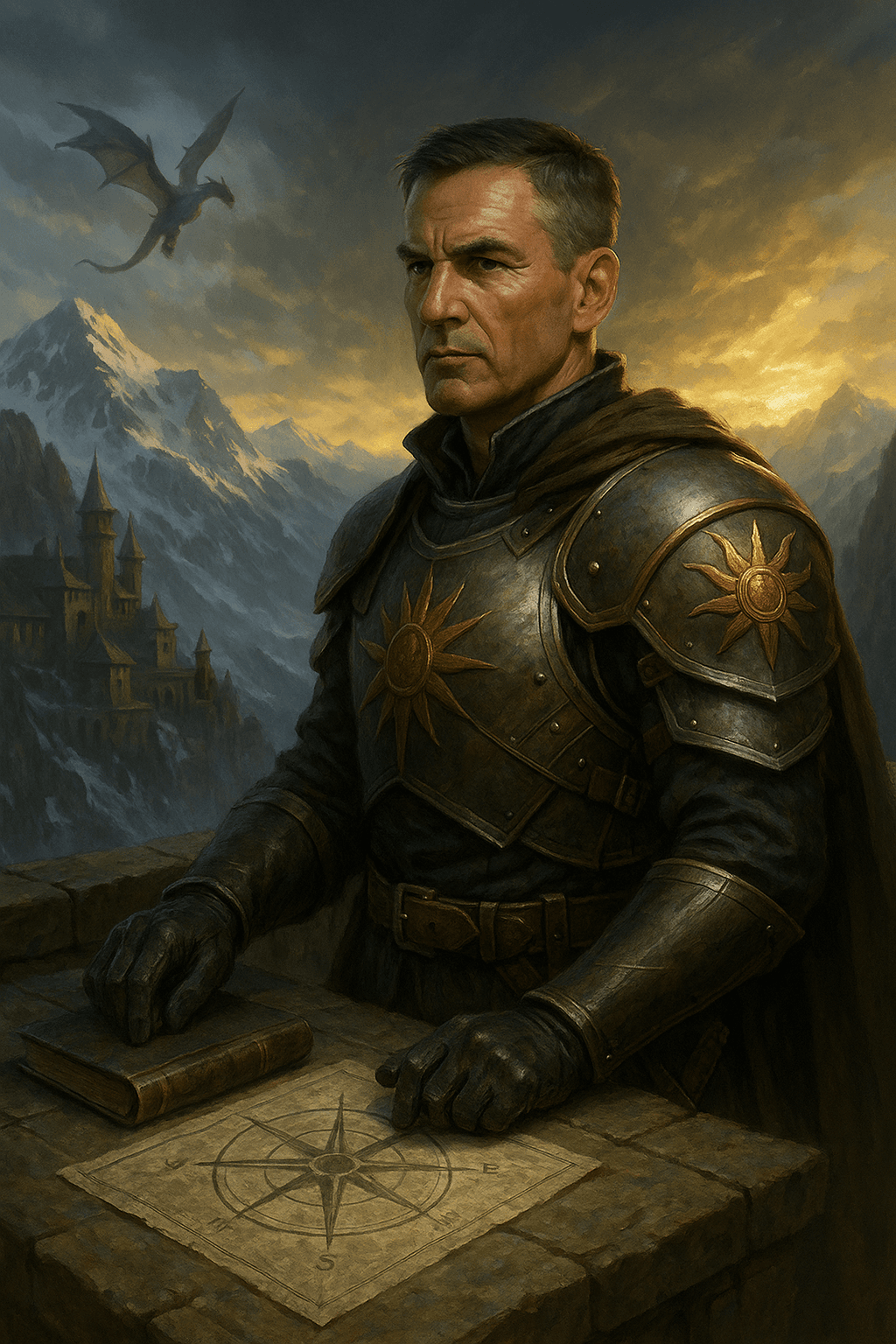 There is a way Ser Kaelen Duskveil sets a training ring that tells you everything about him: chalked wind-roses for approach vectors, buckets of sand for blown landings, a brazier banked low because warmth dulls attention. He speaks little, watches everything, and expects the same of those who would wear the Wardens’ sun. Where other captains posture, Kaelen measures; where others perform, he prepares. In every age that named him, the work was the same—turning courage into craft.