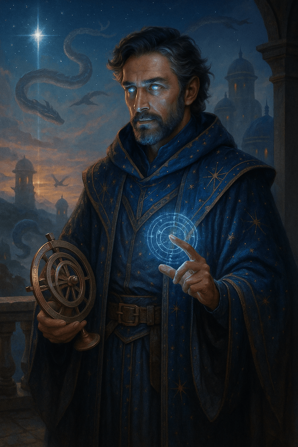 They call him Starseer because he learned to read what others only admired. Elyndor stands at the edge of the Aether Crown’s fractured plazas with a quill in one hand and a stabilizer rod in the other, translating heaven into architecture. Where earlier masters inscribed manifestos, he writes repairs—lines of runes that turn panic into procedure, grief into gravity that keeps the isles from drifting apart.