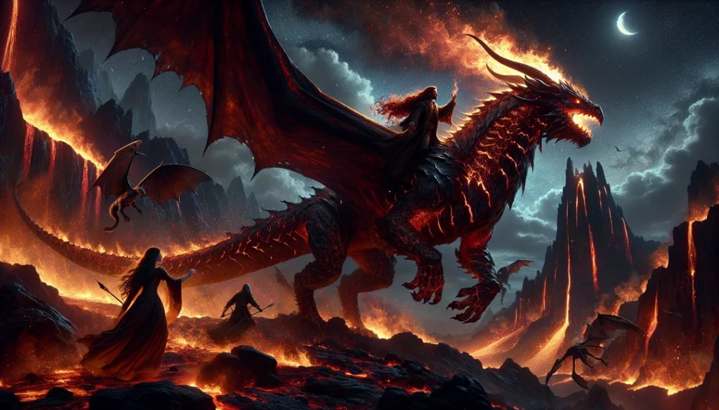 The chase blazed across Thar Zûl’s volcanic plains. Magma-Drakes spat rivers of fire; Ashwings darted through plumes of smoke, their claws raking the sky. But Kindlefang, fueled by the Embercore’s echoes and unbound by mortal will, outpaced them all. Upon the back of the Cindermaw, Kaelin and Lyr clung to each other, hearts pounding as one. Flames licked their skin, not with pain, but with a wild, primal exhilaration. They soared over obsidian cliffs and rivers of lava, the land itself bearing witness to their defiance. But the Embercore’s magic was not without cost. Each pulse sent spasms through Kindlefang’s body—unpredictable, volatile. The lovers realized that to survive, they would have to sooth the dragon’s fury not with chains, but with trust. Kaelin sang the lullabies of the old flame-tenders, melodies almost forgotten by the Choir. Lyr pressed his palm to the beast’s molten scales, sharing visions of freedom and peace. Slowly, the Cindermaw’s rage subsided, its fire growing steadier, more controlled. Behind them, the Choir’s pursuit faltered. The Ashen Disciple raged; the Pyre Lord vowed vengeance. But prophecy, once stirred, could not be unmade. —