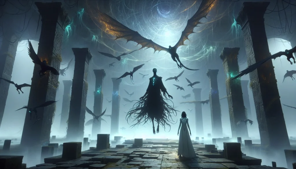 No victory in Duskfall Mire is uncontested. As we neared completion, the Vault’s deepest shadow stirred. A vision—twisted by old resentment—rose from the floor: the specter of Mistcaller Nyvra, Nightshade Weaver’s predecessor, her eyes burning with accusation. “You would rebuild what I sacrificed?” the illusion hissed. “The secrets I entombed are not yours to wield!” I felt the chill of ancient guilt, the weight of thousands of forgotten choices. Tharnshade’s hand trembled on the web, but he did not falter. “We serve the Mire, not the pride of the dead,” he replied. “Your sacrifices are honored, but the world has changed. If we do not adapt, we lose everything.” The specter lashed out, warping the dreamweave, sending ripples of chaos through the Vault. Memory Drakes scattered in confusion, their images clashing—battlefields, betrayals, the face of a dying Duskwyrm. I closed my eyes and reached within, drawing on the hollowness that had become my strength. I whispered, not to the specter, but to the Vault itself: “Let the past be remembered, but do not let it rule us. We are not what we were—we are what we choose to become.” For a moment, everything hung in balance. Then the specter dissolved, her voice fading into a sigh. The dreamweave quieted, the illusions settling once more. Tharnshade looked at me, respect shining in his shadowed gaze. —