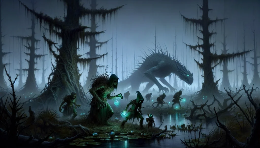 The bramble-fog around Banehollow Pool was the Mire’s oldest ward—thick, enchanted, and alive with magic. To outsiders, it was a labyrinth of shifting shadows and illusions. To Vell, it was a living map; he read its signs in the curl of a tendril, the pattern of dew on a leaf. But tonight, the fog was restless. Shapes moved within—too large for Memory Drakes, too deliberate for wild beasts. Slinkroot faded into the murk, his Proto-Shadekin senses attuned to the tremors of foreign minds. He tasted the residue of fear and ambition, the psychic scent of intruders unused to the swamp’s tricks. They stalked their prey in silence, circling the pool, listening. From within the brambles, muffled voices—harsh, urgent—echoed. Vell crept forward, weaving through roots, until he spied the intruders: two Thornspine Beastkin, their bark-like skin studded with poisonous quills, and a druid in Galdrowen’s green. Between them, the stolen memory crystals pulsed with faint blue light. The druid muttered incantations, trying to coax secrets from the crystals. The Thornspines watched the fog, spears at the ready. Slinkroot flickered into view beside Vell, his voice nearly soundless. “We need the crystals intact. Cause a distraction. I’ll take the druid.” Vell nodded, slipping away into the undergrowth. Moments later, the fog thickened, swirling unnaturally. A Duskwyrm’s silhouette, vast and serpentine, loomed overhead—whether real or illusion, none could say. The Thornspines shouted, quills bristling. The druid faltered, eyes wide in terror. Slinkroot struck without warning, silent as the grave. The druid barely had time to gasp before Slinkroot’s shadow-wrapped hands closed around his throat, pulling him into the darkness with terrifying efficiency. Vell emerged from the mists, vines lashing, knocking one Thornspine into the pool with a splash. The second, panicked, hurled a spear that vanished harmlessly into the bramble-fog. The crystals tumbled from the druid’s grasp, rolling into the mud. With the Galdrowen party in disarray, Vell and Slinkroot seized the precious memory stones and melted into the mire, the Duskwyrm’s distant cry echoing triumphantly overhead. —