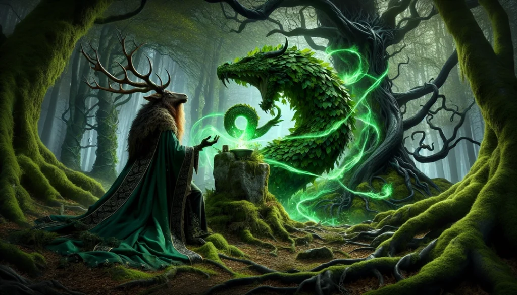 The leyline pulsed beneath my hand, and the seed took root. From the earth, a great shape coiled upward—bark and scale, leaf and claw—until Elder-Green stood before me, resplendent and immense. Its breath was the scent of rain and blooming things. “You have done what many feared—facing the wound alone,” it spoke, through the chorus of rustling branches. I bowed my antlered head. “Galdrowen’s heart cannot survive on division. The Circle debates—contain or cleanse—but the forest calls for healing.” Elder-Green’s tail swept the glade, and wherever it touched, new growth sprang: ferns, wildflowers, saplings. “Your courage has rekindled the primal bond. But healing is not the end. The Circle must choose—fear or trust, stagnation or wild renewal.” It touched my chest with a talon, and a rush of memory—of the forest whole, before the Shattering—filled me. Then Elder-Green vanished, dissolving into a spiral of glowing leaves, its task begun. —