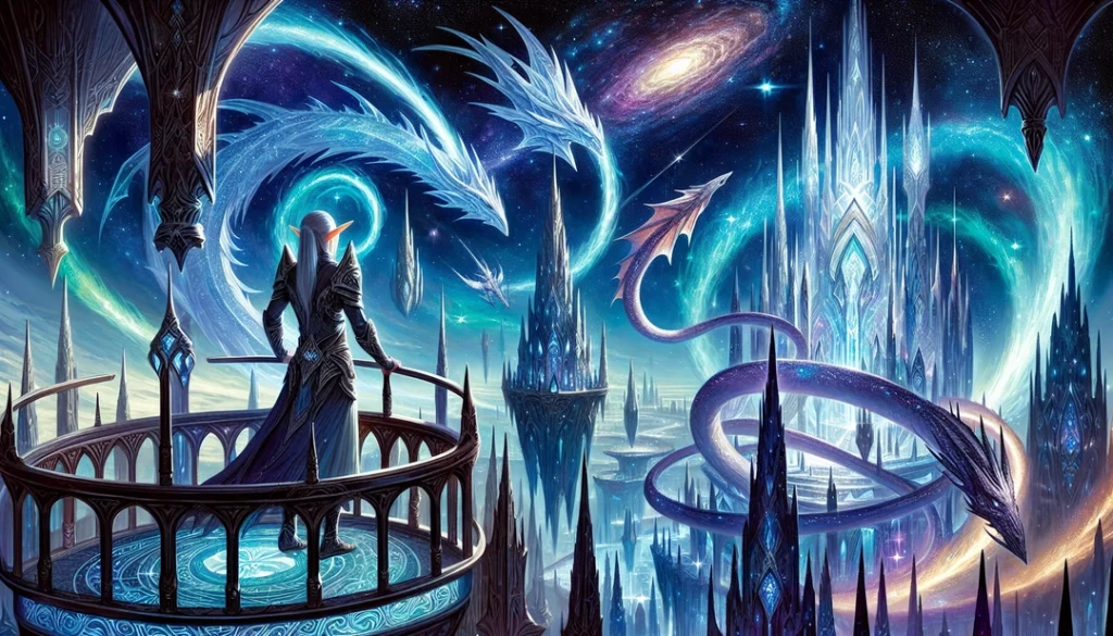 Before embarking on my journey, I sought the wisdom of the Star-Serpents, the guardians of our spires. These wise creatures, entwined around our mage towers, whispered secrets of the stars to those they deemed worthy. One such serpent, Elysion, had been my companion since my early days in the Order. His scales glimmered with cosmic energy, and his eyes held the knowledge of countless ages. “Guide me, Elysion,” I implored, “for I seek to understand the astral flows and their connection to our world.” Elysion’s voice resonated within my mind, a gentle yet commanding presence. “The stars are more than mere points of light, Aliseth. They are the threads that weave the tapestry of fate. Follow them, and you shall uncover truths hidden from mortal eyes.” With Elysion at my side, I felt a surge of confidence as we ascended into the skies, leaving behind the familiar comfort of the Aether Crown. —