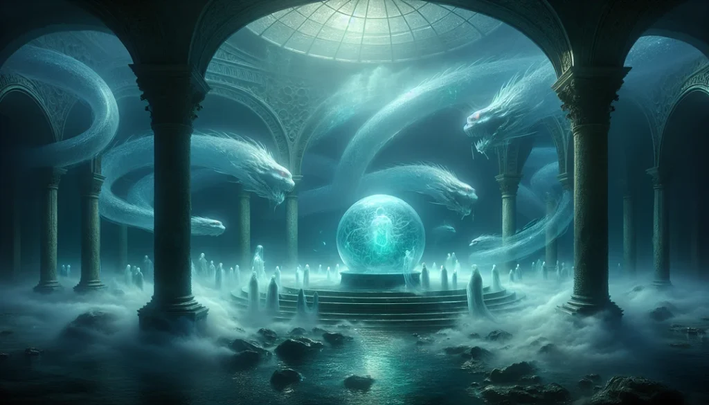 As I descend deeper into the labyrinth of ruins, the water around me shimmers with a spectral light. The Mist-Dragons, those melancholy guardians of memory, glide silently above, their eyes reflecting the sorrow of our lost civilization. They watch over us, emerging only when the past demands acknowledgment or defense. Today, they remain silent witnesses, acknowledging my quest.