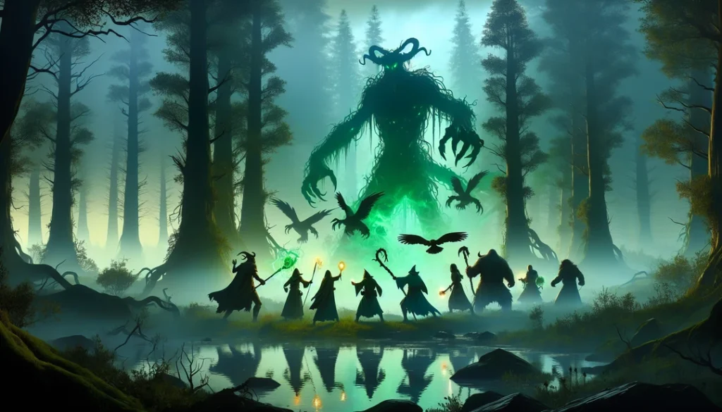 *Before I could react, he gestured, and the very shadows around him coalesced into grotesque shapes. From the depths of the Mire, shadow beasts emerged, twisted forms of vine and darkness, their eyes glowing like embers. The Verdant Circle stood ready, but fear gnawed at my heart. Had Caelum truly delved too deeply into the mists?*