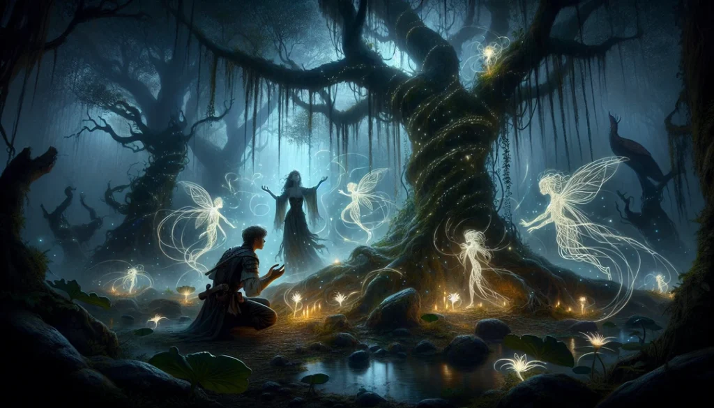 The ground trembled, and from the shadows emerged a spectral figure, wreathed in vines that seemed to pulse with a life of their own. “Why do you disturb my slumber?” it hissed, voice like rustling leaves in a storm.