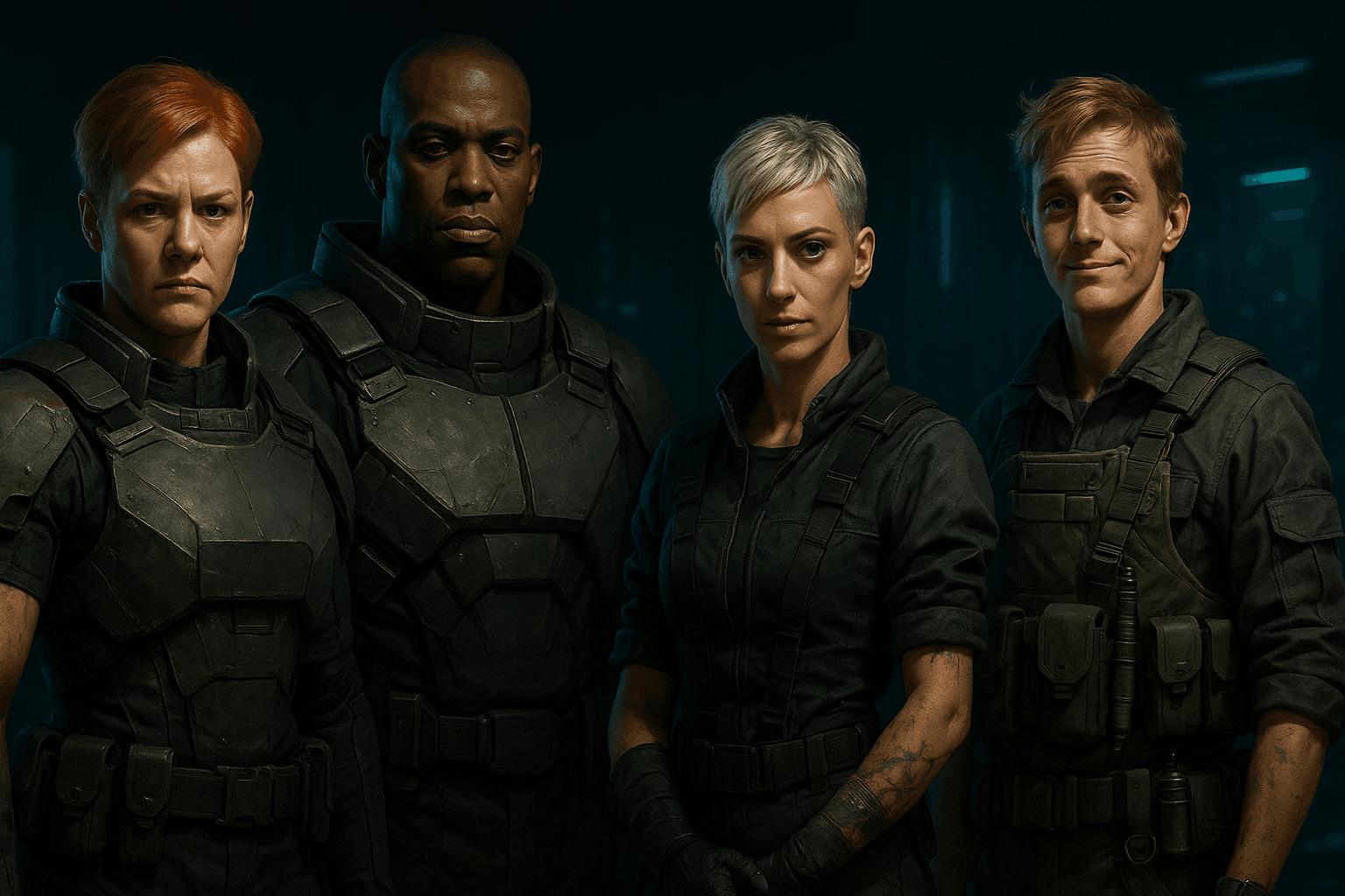 Muscular and broad-shouldered, Capt. Renna Korr moves like a storm contained in armor. Her ash-grey tactical suit bears the wear of dozens of hazardous deployments, while her short red hair is the only visible defiance of regulation. Known for her booming voice that cuts through static, Renna commands with both force and precision.