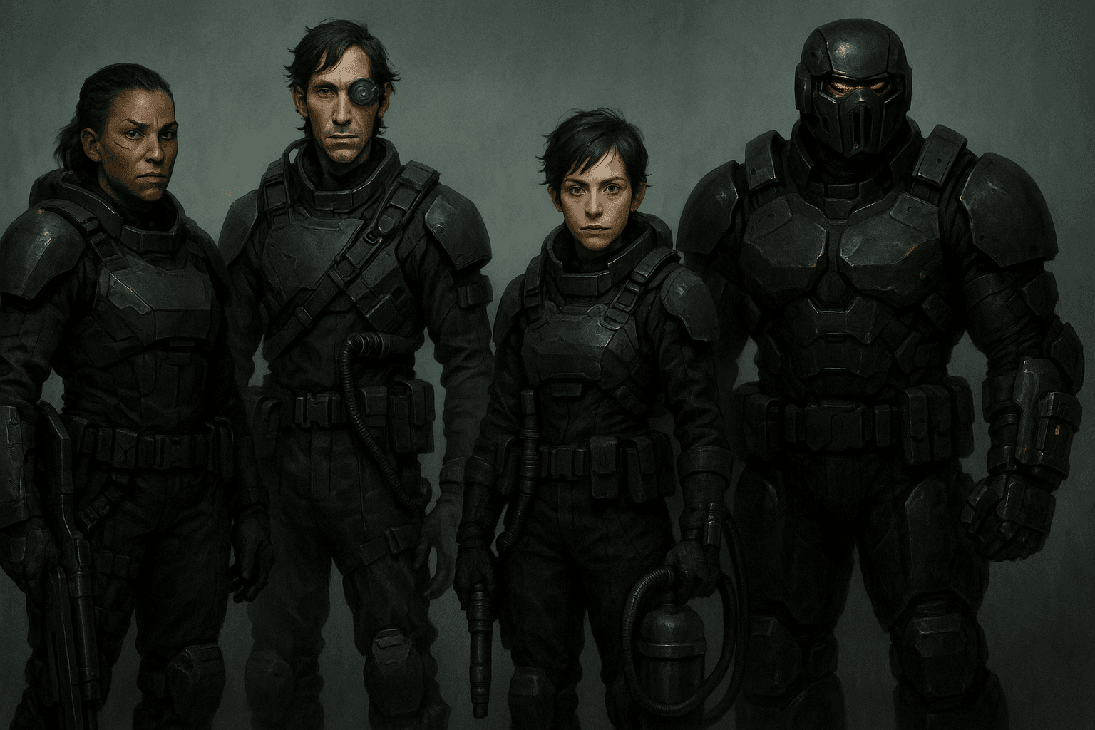 Jorr Talvek is TRU-7’s blunt instrument, a towering figure encased in reinforced black carapace plating, shock coils glowing faintly along his forearms. His voice, filtered through a modulator, is as inhuman as his presence — a deliberate intimidation factor when facing resonance entities that may respond to perceived threat. Before joining TRU-7, Jorr fought in underground pararesonant gladiator circuits, where survival meant adapting to unpredictable and often monstrous opponents. That history left him with both the skillset and the mindset to confront whatever comes through a breach, no matter how alien or hostile.