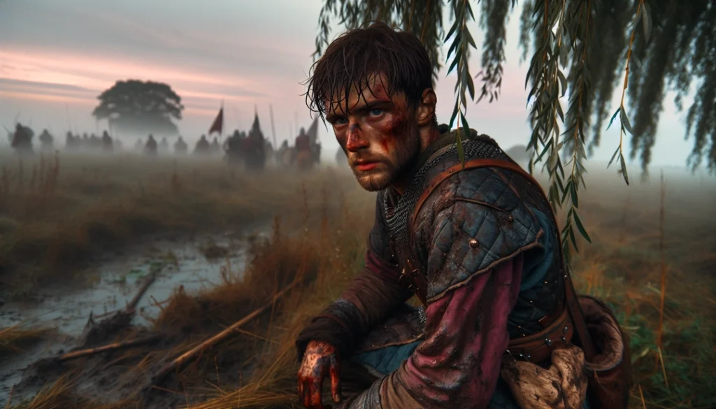 When Osric woke, the battle had passed him by. The marsh was eerily quiet, broken only by the distant shouts of the victors and the groans of the wounded. The sun hung low, casting red light across the carnage. He staggered to his feet, head pounding. The ground was littered with bodies—Northumbrian, Cymry, Mercian alike. Flies already gathered in thick clouds. Osric’s sword was gone, his shield lost. He saw Eadwine’s cloak near a cluster of the dead, but when he turned the face, it was not his friend. He tried to remember the last moments—the king’s banner falling, the rout, the desperate voices calling out for Edwin. But Edwin was nowhere to be seen. Rumor would soon spread: the king was dead, slain in the marshes, his son Osfrith captured. Osric limped away from the battlefield, heart heavy. He passed a group of Cymry stripping the dead, their laughter harsh and bitter. He slipped into the reeds, crawling on his knees, hiding whenever foreign voices grew near. Night fell. Osric found a hollow beneath a willow and huddled there, shivering. He dared not light a fire. The marsh was alive with the sounds of victory feasts—Cadwallon’s men celebrating their triumph. He felt the loss keenly—not just of comrades, but of the world he had known. Edwin’s reign had brought stability, a measure of peace. Now, all was chaos. Somewhere in the darkness, a woman’s voice sang a keening lament for the dead. Osric closed his eyes and let the grief wash over him. —